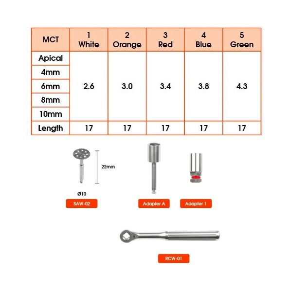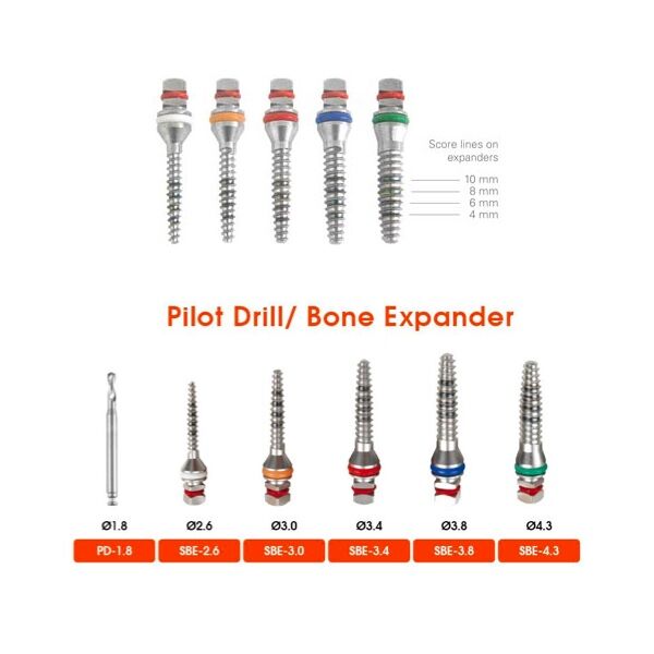 - 5 color-coded bone expanders (2.6, 3.0, 3.4, 3.8 and 4.3mm), plus Pilot Drill: 2.0mm Pilot Drill and Saw