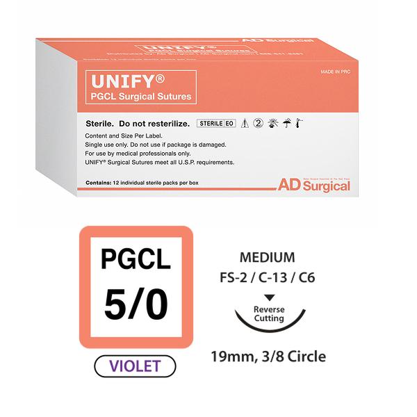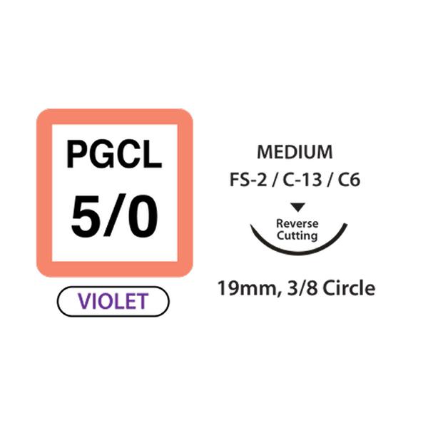 PGCL Surgical Sutures, Violet, Size 5/0, 18in Thread with 19mm 3/8 Circle R/C Needle. Box of 12.