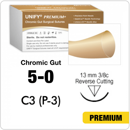 Premium Chromic Gut 5-0 suture with ultra-sharp precision point, P3 (C3), reverse cutting needle (13mm, 3/8 circle), for delicate procedures. 12 per box.