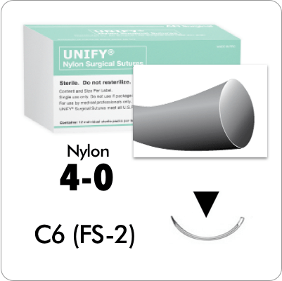 Nylon 4-0 Suture, from Unify, with FS2 (C6) Reverse Cutting Needle (19mm, 3/8 Circle ). 18". Sold 12 per box. Comparable to Ethilon * and Monosof **