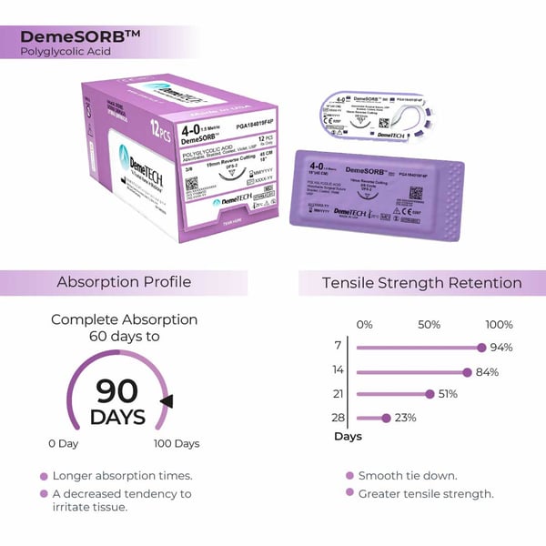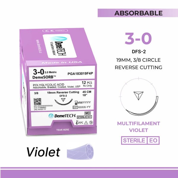 PGA (Polyglycolic Acid) 3-0 Violet Suture, with FS2 (C6) Reverse Cutting Needle (19mm, 3/8 Circle). 18"(45cm). Sold 12 per box.