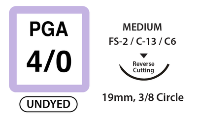 PGA (Polyglycolic Acid) 4-0 Colorless/Undyed Suture, with FS2 (C6) Reverse Cutting Needle (19mm, 3/8 Circle). 30"(75cm). Sold 12 per box. Look Comparision: 423B Ethicon Comparison: J423H. **IMPORTANT: These PGA sutures are undyed/colorless.**